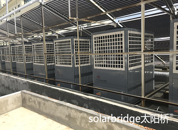 配置太陽橋空氣能TYQ-KFXRS-75II/SL機(jī)組8臺,太陽橋太陽能集熱器TYQ-1800/58-50G模塊28組,共1400支玻璃真空管。